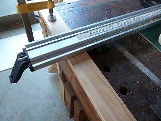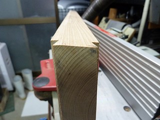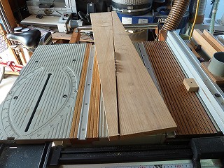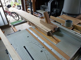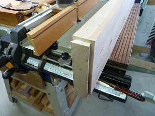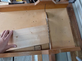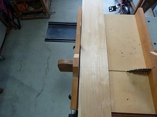 | 7.手押しカンナで端面を直角に。 | 8.テーブルソーで幅140oにカット。 | |