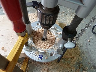 | 13.柱に使う部材の端を83.4度にカット。 | 14.トラクターに取り付ける穴加工。フォスナービットは1/2インチだ。 | |