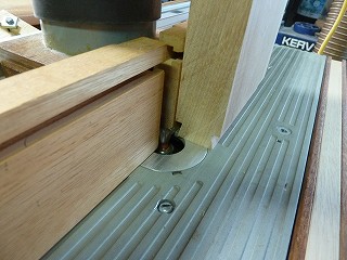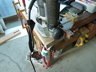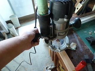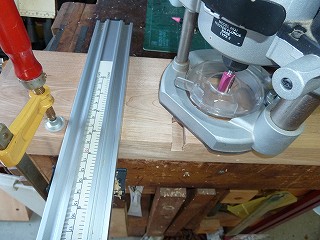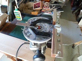| 15.アリ溝加工に使うビットは1/2インチだ。ルーターにスライドガイドを取り付けて、ビット位置を調整。 | 16.アリ溝のメス部加工中。 | |