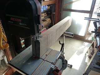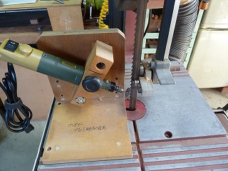 | 1.177mm角の桜材を挽き割るために、バンドソーのブレードを15mm幅に交換して研磨だ。 | 2.桜は硬いのでブレードの切れを良くしておくと安心だ。 | |