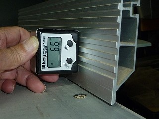 | 21.梁部材の上端に角度を付けるために、手押しカンナのガイドを6.6度傾けた。 | 22.端面が全面削れるまで加工。 | |