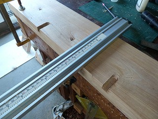 | 17.完成したアリ溝。端部はノミで綺麗に仕上げた。 | 18.柱に渡す梁材を所定の長さにカット。 | |