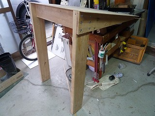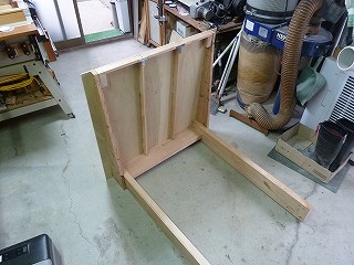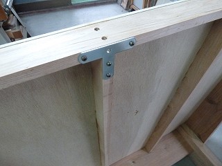 | 37.寸法チェックで問題がなかったので、イエローボンドを塗って最終組み立てだ。 | 38.斜めのステー材を入れていないので、T字の金具で補強した。 | |