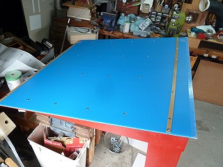 | 41.天板に張り付けるプラ段の中空部は強力テープで塞いだ。塞いでないと埃が入ったり、虫が巣を作って汚くなるのだ。 | 42.プラ段を抑える15mm幅のプラスチック板。強度が足りないのでステンにした方が良かったかも。 | |