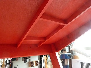 | 45.運転してみるとエンジン音が天井に共鳴して、太鼓のような音がしている。5.5mmの合板では薄かったかも。そこで梁を増やすことに。 | 46.強度が増して共鳴はかなり少なくなったが、まだ少し気になるかな。 | |