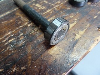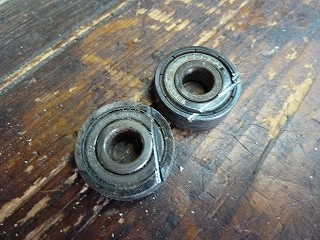 | 5.挽き割の最後の方でバンドを受けるベアリングから火花が出ていたので、分解するとベアリングが固着して廻っていなかったようだ。 | 6.新品のベアリング608ZZに交換。使う前にしっかりと調整すべきだったな。 | |
