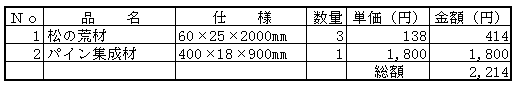 材料は25×60の荒材(杉)、60の角材(松)と天板用には集成材を使ってみました。角材は新築現場で端材をもらってきましたのでタダです。
