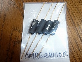 3.三十数年振りに電源を入れた6GA4PPのパワーアンプ、どうも低音がイマイチに聞こえる。そこでカソードに抵抗を入れてDCバランスをとった。抵抗はアマゾンで購入した、最高級オーディオ用カーボン抵抗 2W 10Ω。一本360円。 |