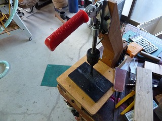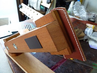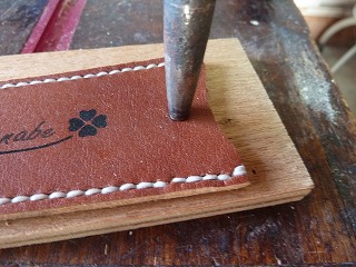 9.慌てていて写真を撮り忘れたが、張り合わせた革に目打ちスタンドで菱目をあけて縫製準備。自作目打ちスタンド |
