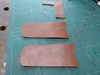 6.型紙を革の上にのせて型を鉛筆でマーキングしてから、カッターで切抜いた2枚の革。 |