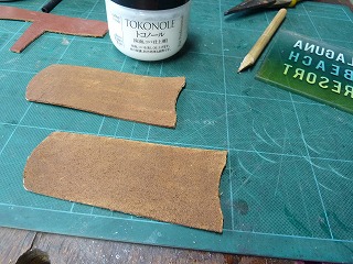7.革の裏面の毛羽立ちを抑えるために、トコノールを塗って乾燥させる。 |