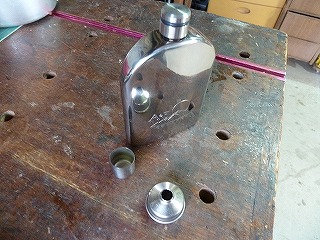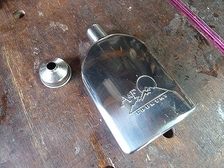 アルコール燃料が足りないかなと思うときは、はA&F COUNTRY社製のチタンスキットルに入れて携行している。 |