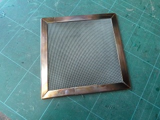 UNIFLAMEのバーナーパッドS。120×120×2.4mmtで材質はSUS。自作しようと思ったが、通常の材質では耐熱が心配なので既製品を購入した。このパッドの材質は枠がSUSでメッシュは、FCHW2(鉄クロム電熱線平織金網)が使われている。見た目では30meshくらいかな。 |