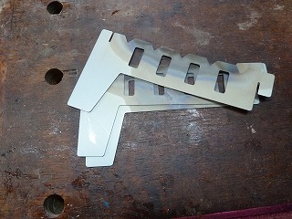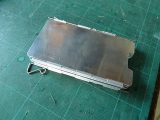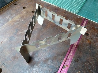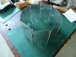 アルコールバーナー用に、amazonで買ったウィンドスクリーン。72o幅の板が9枚繋がって全長が650mm、高さ135mmのアルミ製だ。バリが出ているのでヤスリで仕上げると安全に使える。383円とリーズナブルだ。 |
