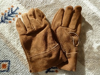メスティンを掴むために買った手袋。オイル仕上げの革製で、しなやかで使い勝手はいいと思う。ワークマンで795円なり。 |