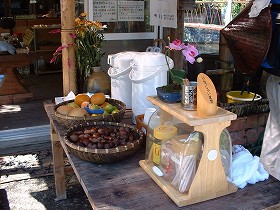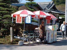 | 番外.。青龍寺駐車場横には珊瑚の工房があり、軒先には季節の果物やコーヒーが接待で置かれている。頭が下がる思いだ。