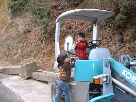 番外仙遊寺入り口に止めてあった小型ブルで遊ぶ彩嘉と秀門。 |